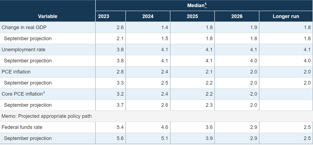 '23년 GDP 전망치는 9월 FOMC 전망 대비해서 상향되었으며, PCE는 하향 조정하였습니다.