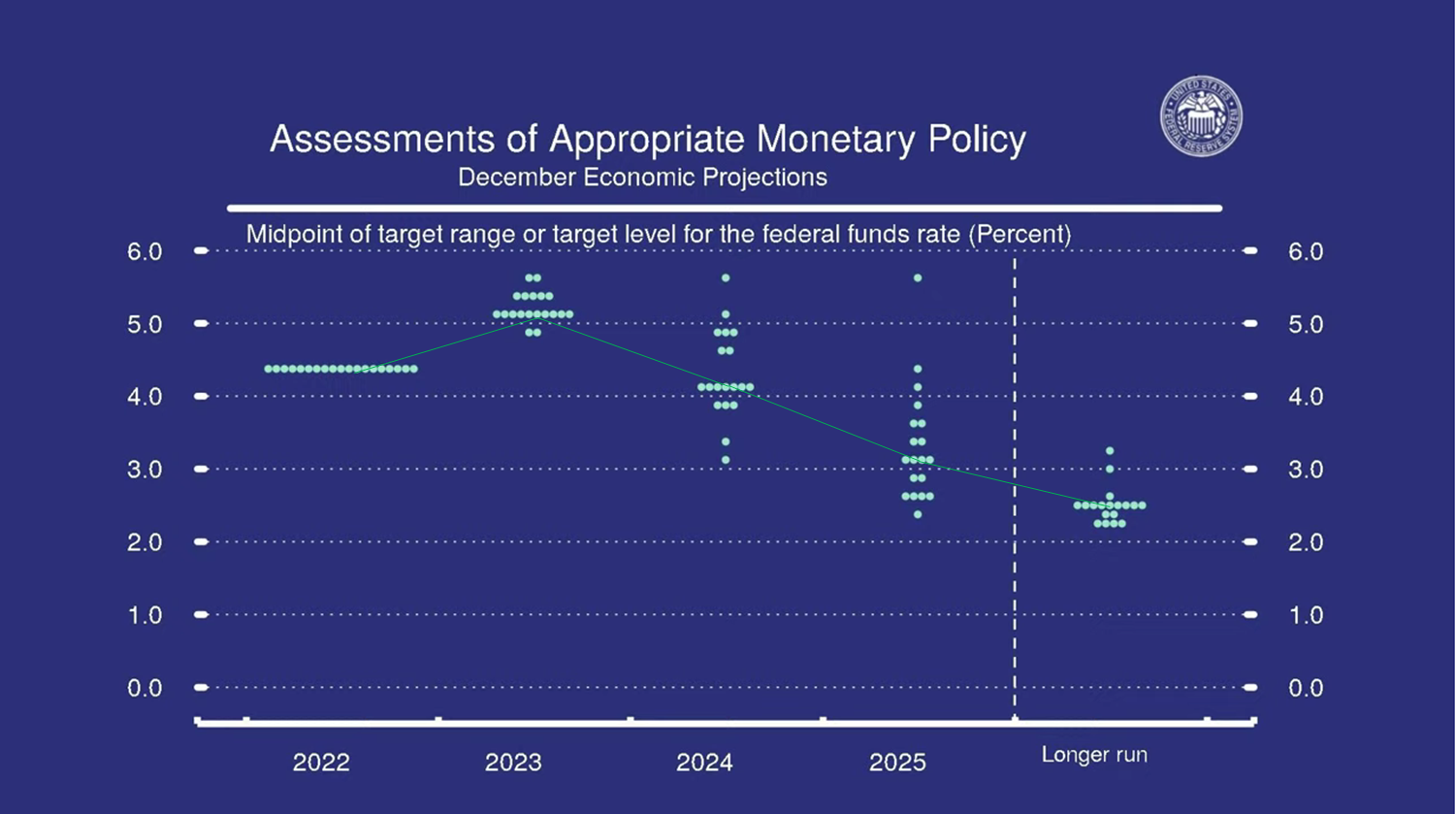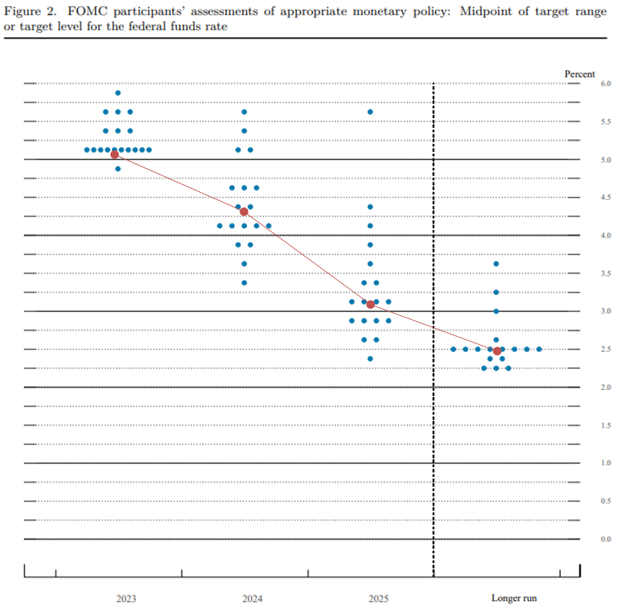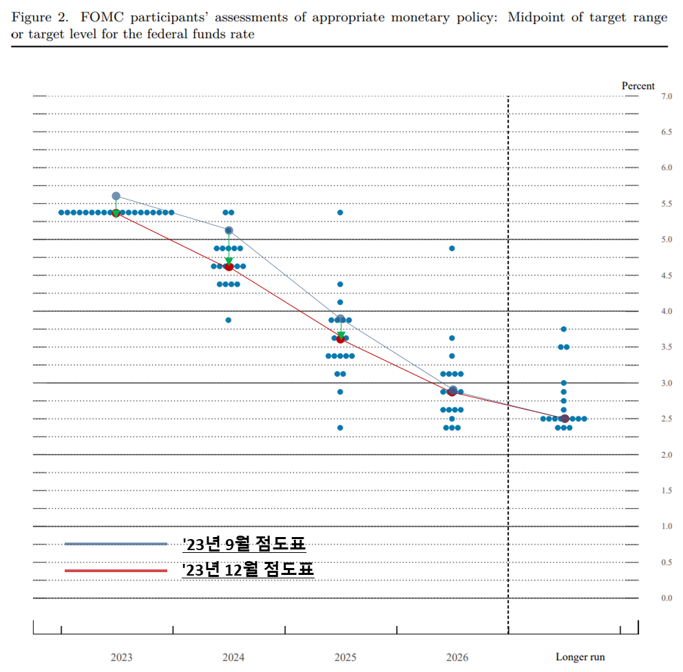 [2023.12.14] 12월 FOMC 결과, 미국 기준 금리 동결(5.25~5.50%) 결정. 24년 금리 4.6% 전망. 내년 3차례 금리인하 전망(역대 미국 기준금리 변화, FOMC 일정, 금리인상 전망, 점도표, SEP)